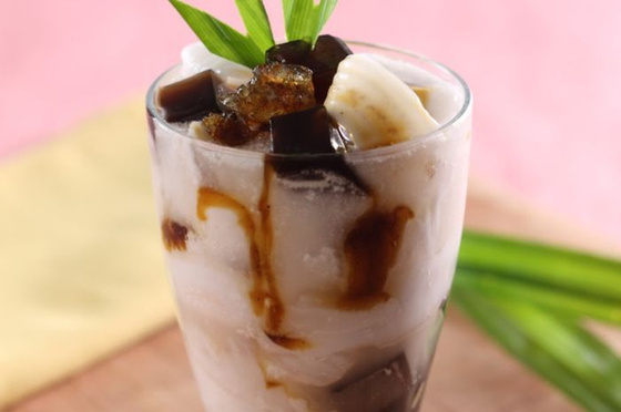 Minuman ini memiliki perpaduan bahan yang sedikit unik seperti daging kelapa muda, cincau hitam, santan, gula merah dan pandan.