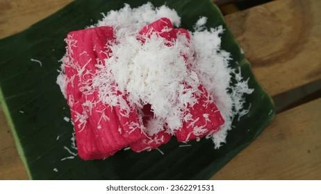 Kulitnya terbuat dari tepung beras ketan dengan isi parutan kelapa muda dan gula aren lalu dibungkus dengan daun pisang berbentuk prisma segi empat.